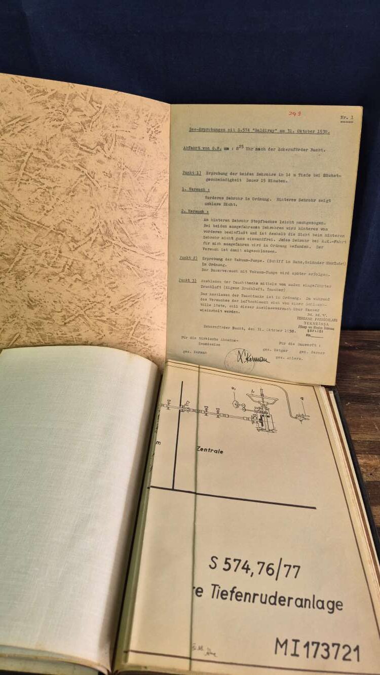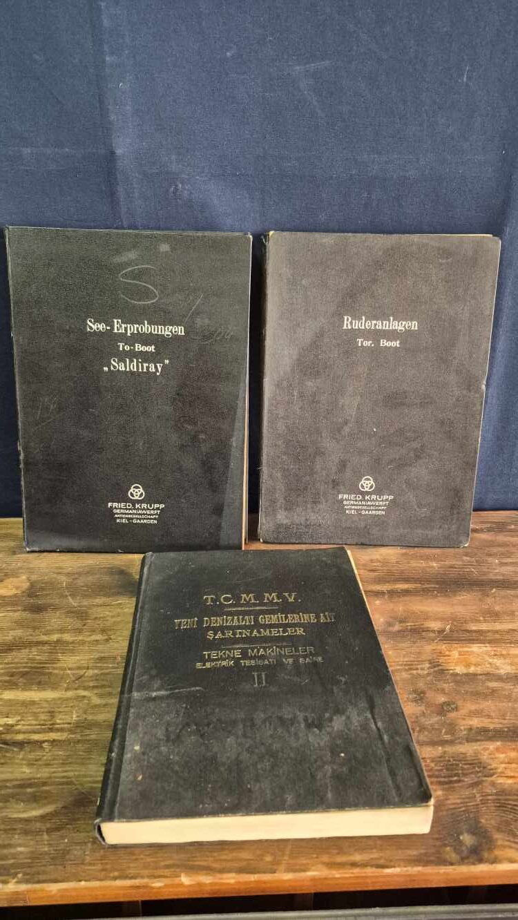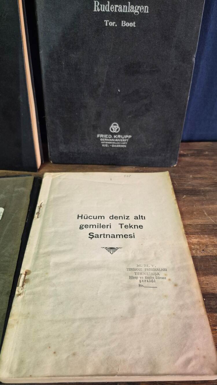 Deniz testleri dökümanı (Almanca, imzalı, 22×30 cm, 200 sayfa) ve dümen dökümanı (Almanca, 3 adet detaylı çizim, 22×30 cm) Türk ve Alman mühendisler tarafından imzalanmıştır, bez kaplama cilt,