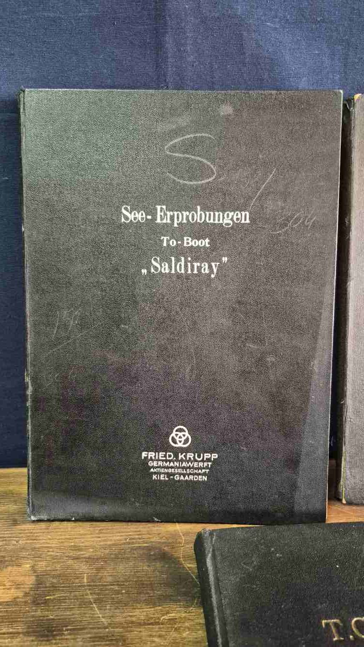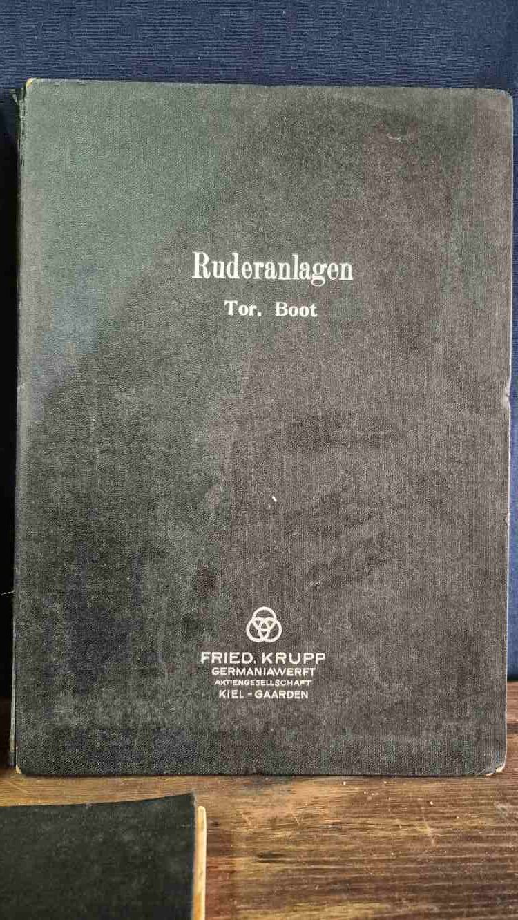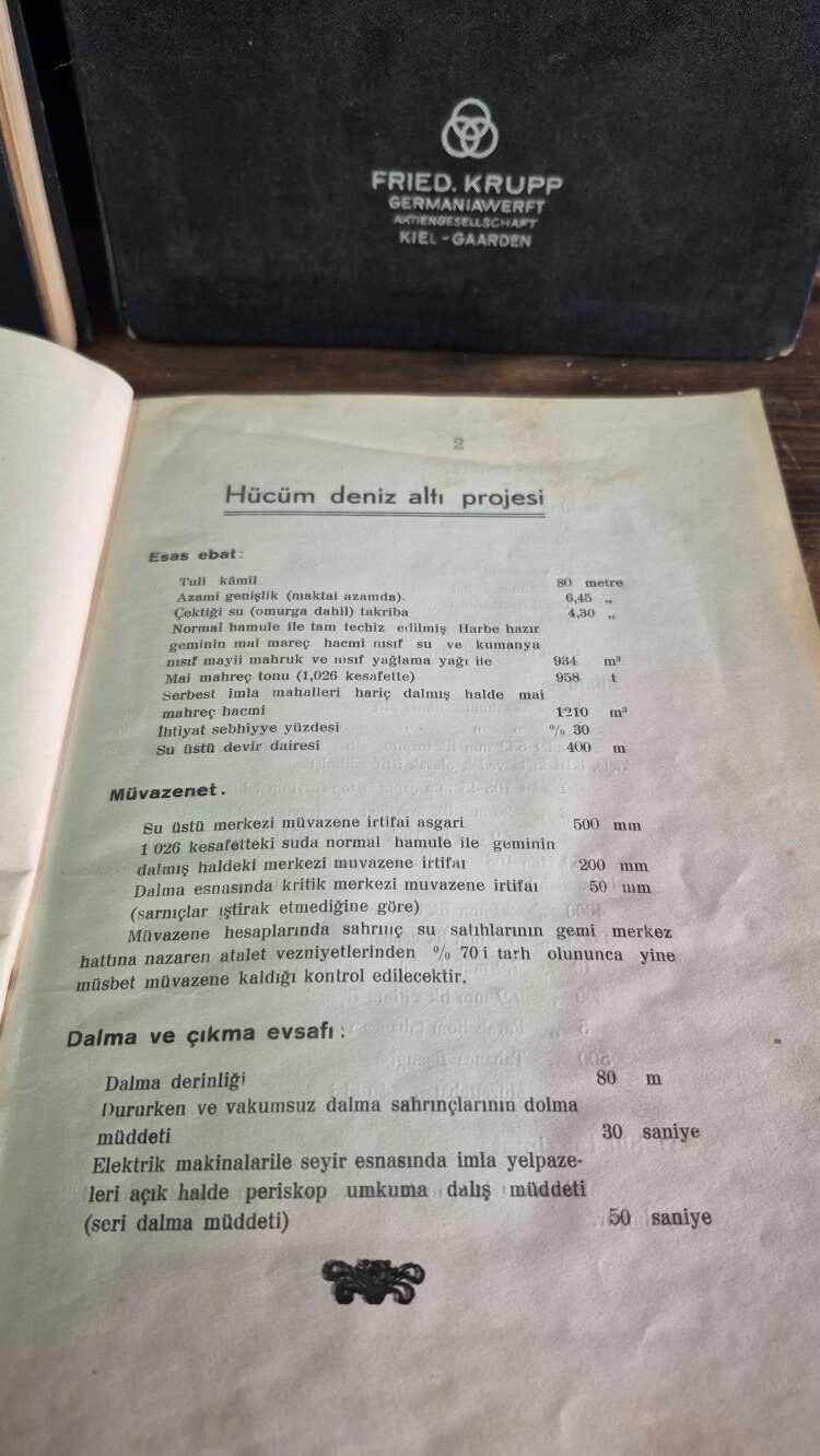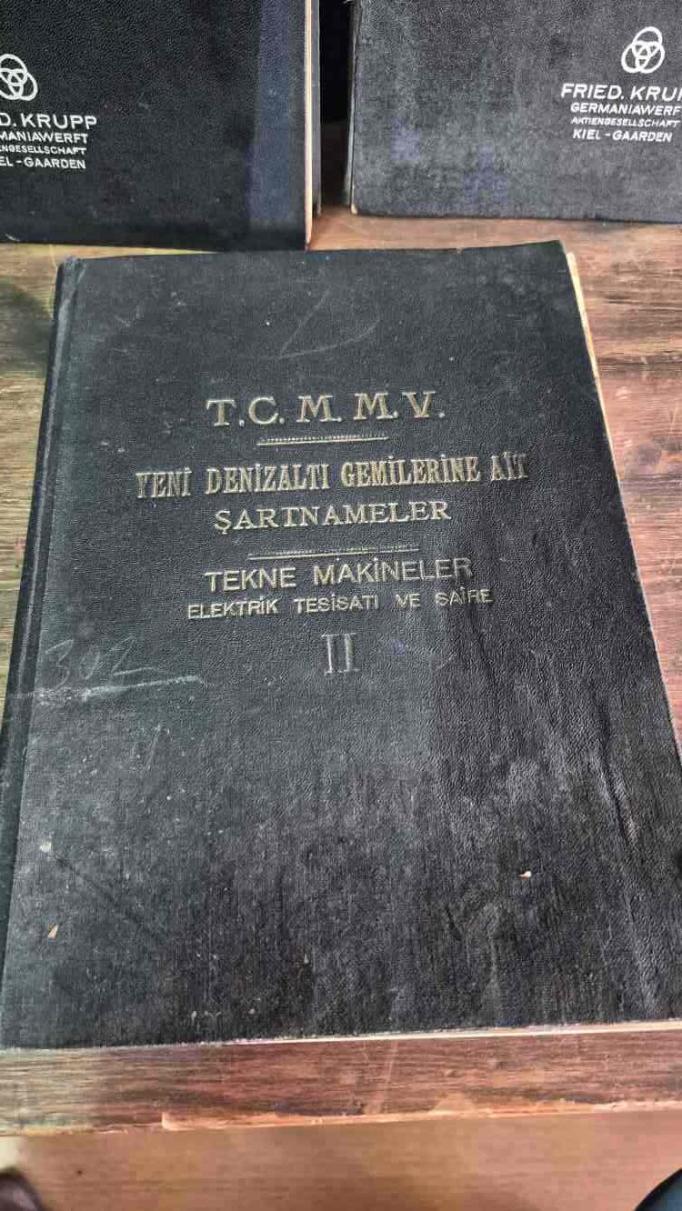 Deniz testleri dökümanı (Almanca, imzalı, 22×30 cm, 200 sayfa) ve dümen dökümanı (Almanca, 3 adet detaylı çizim, 22×30 cm) Türk ve Alman mühendisler tarafından imzalanmıştır, bez kaplama cilt,