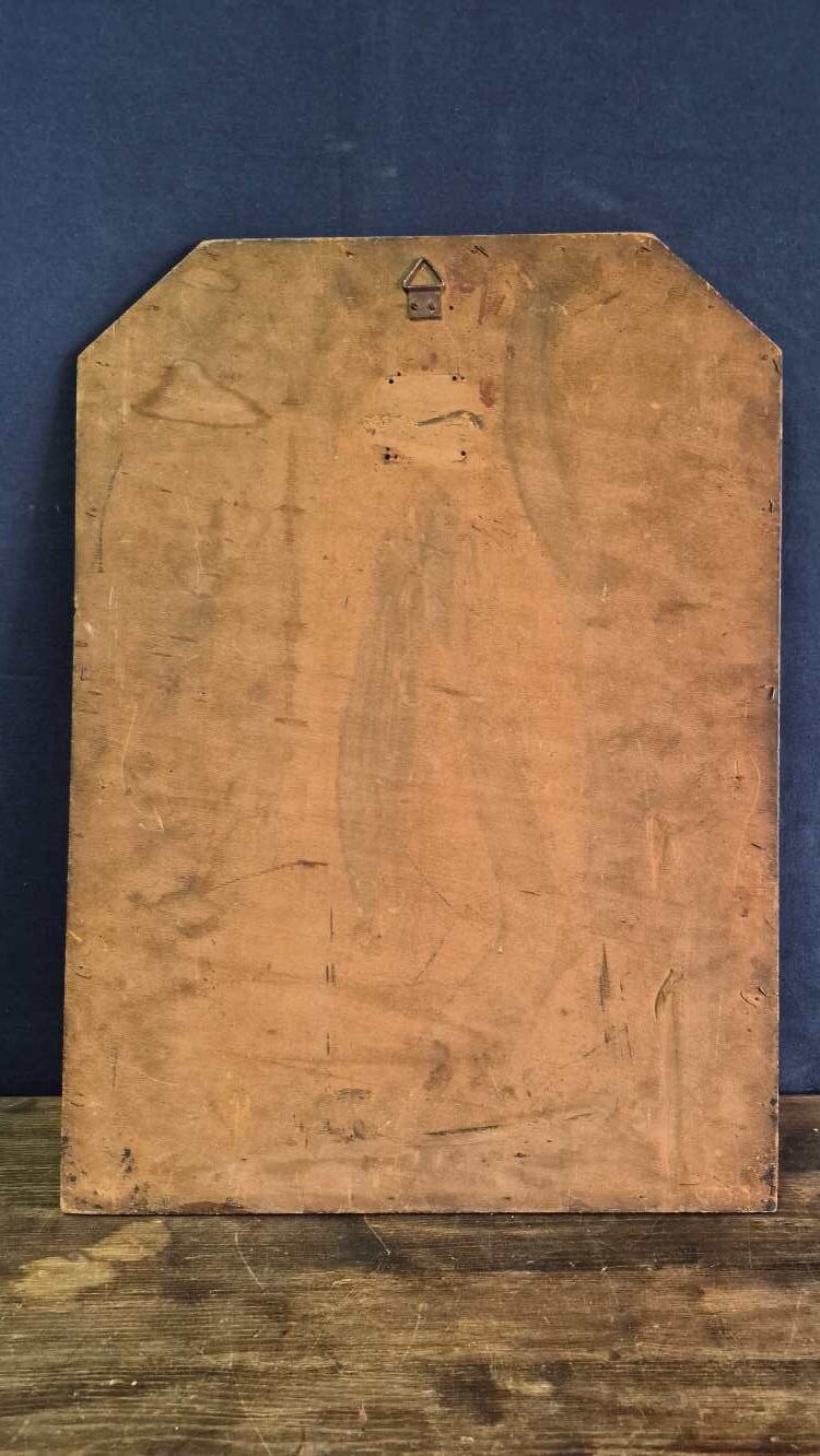 Ahşap üzerine bakır plakaya oyma yöntemi ile yapılmıştır.