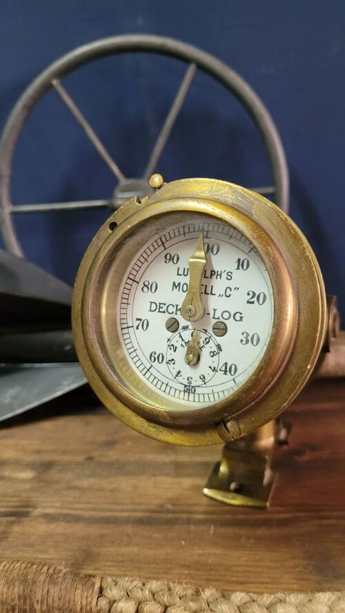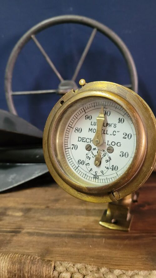 Güverteye monte edilen pirinç ölçüm başlığı, pik döküm dümeni, pirinç pervanesi ve fırdöndüleri ile tam takım, markalı, logolu,
