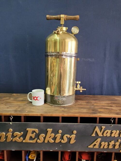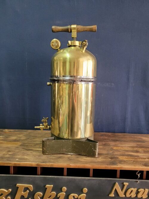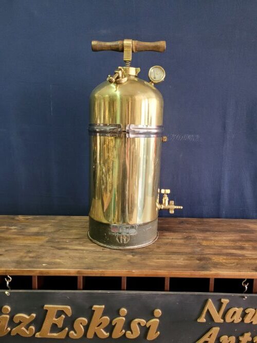 Altın parlaklığında ana gövdesi ile etrafını aydınlatan 10 litrelik pirinç malzemeden imal edilmiş ilaçlama tüpü,
