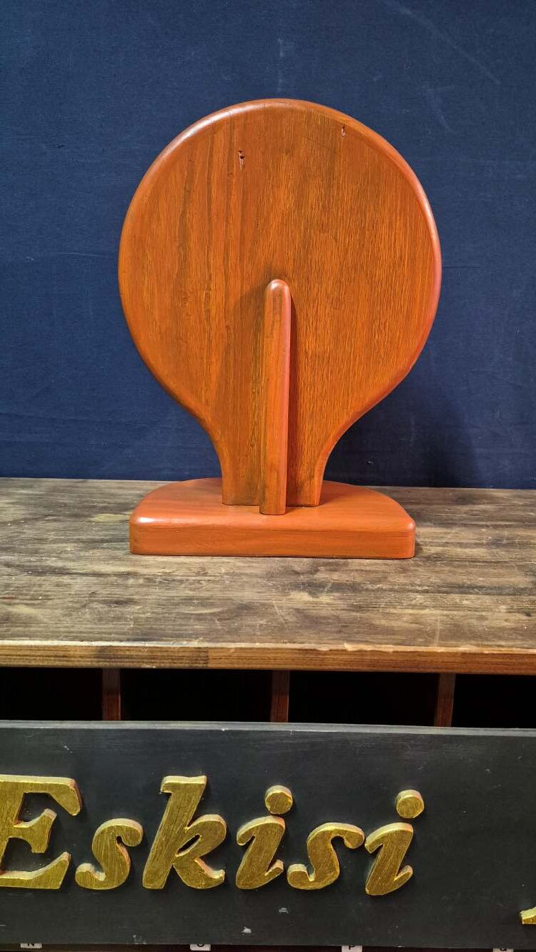 Masif ahşap tik ağacı taban üzerine dikey olarak monte edilmiş, ahşap çapı 26 cm, saat alt çapı 22,86 cm, saat üst çapı 15,24 cm,